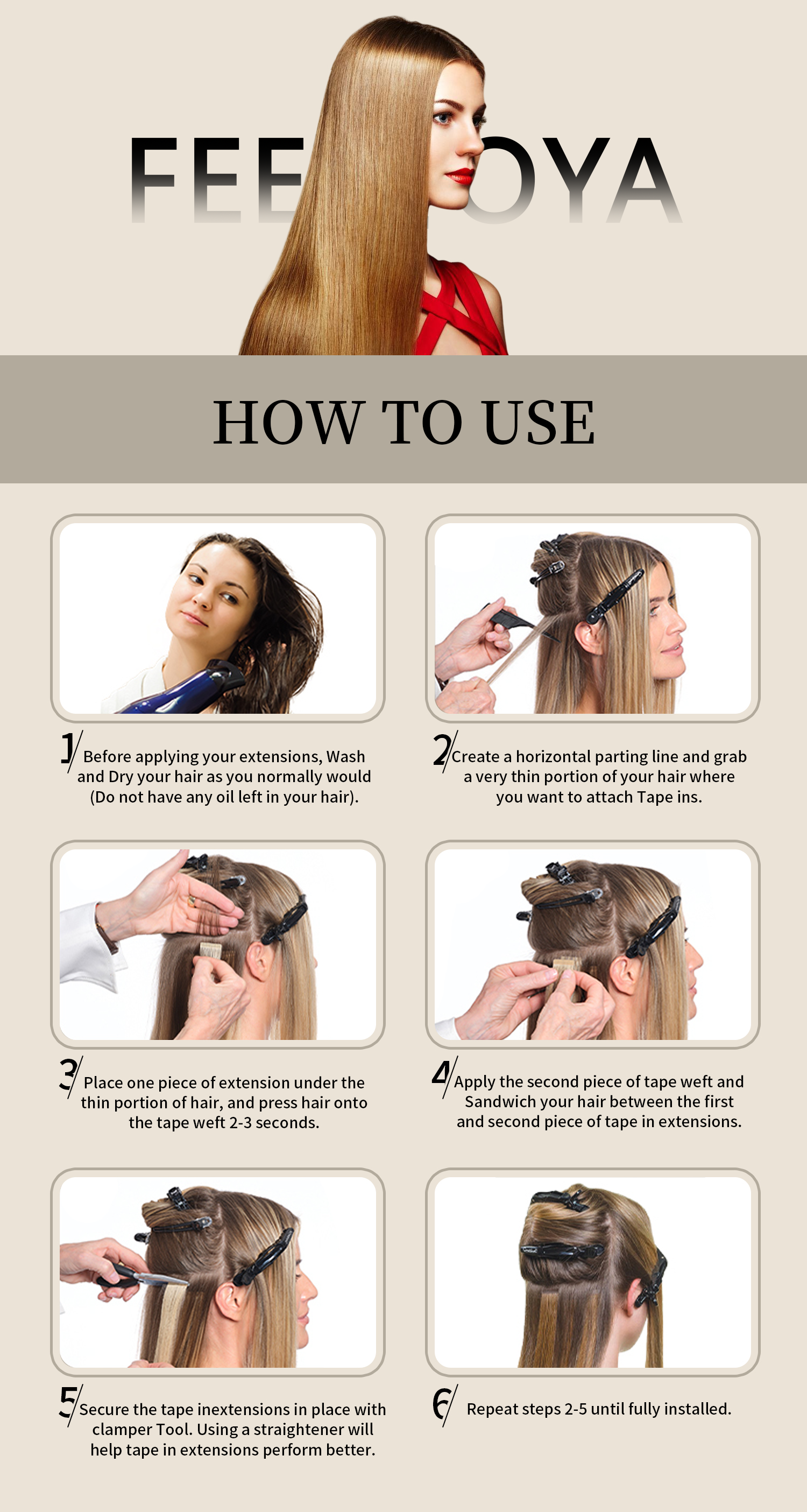 - Always remember to shampoo your hair without any conditioner before taping them in as any grease or oil could make the tape slip.